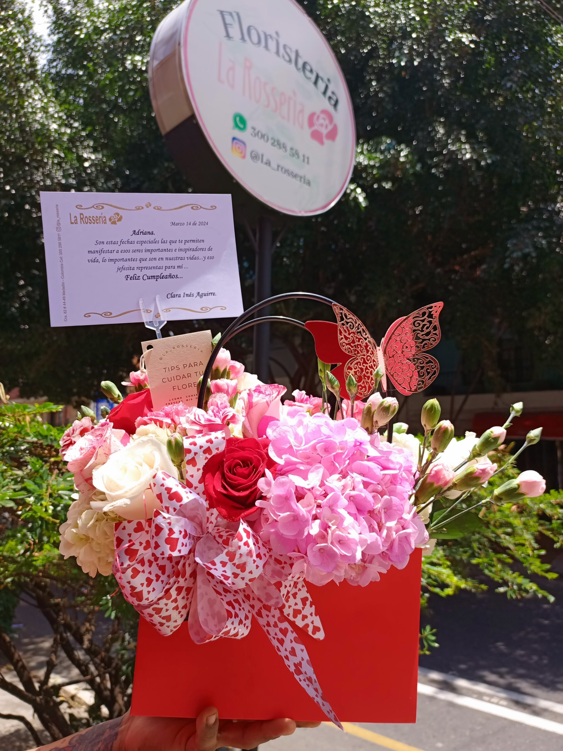 Cartera roja con arreglo floral, 4 rosas, hortensias, clavellina, follaje rusco, moño, decoración mariposa y tarjeta para mensaje.