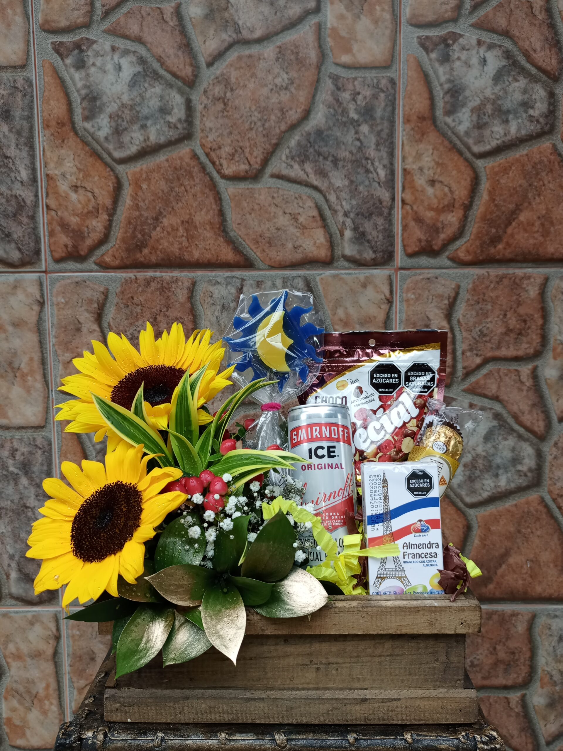 Arreglo floral en base de madera con 2 girasoles, canción de la india, follaje hipérico, gipsofilia, rusco, vela, lata smirnoff, maní la especial, chocolates ferrero x3, caja de almendras y tarjeta para mensaje.