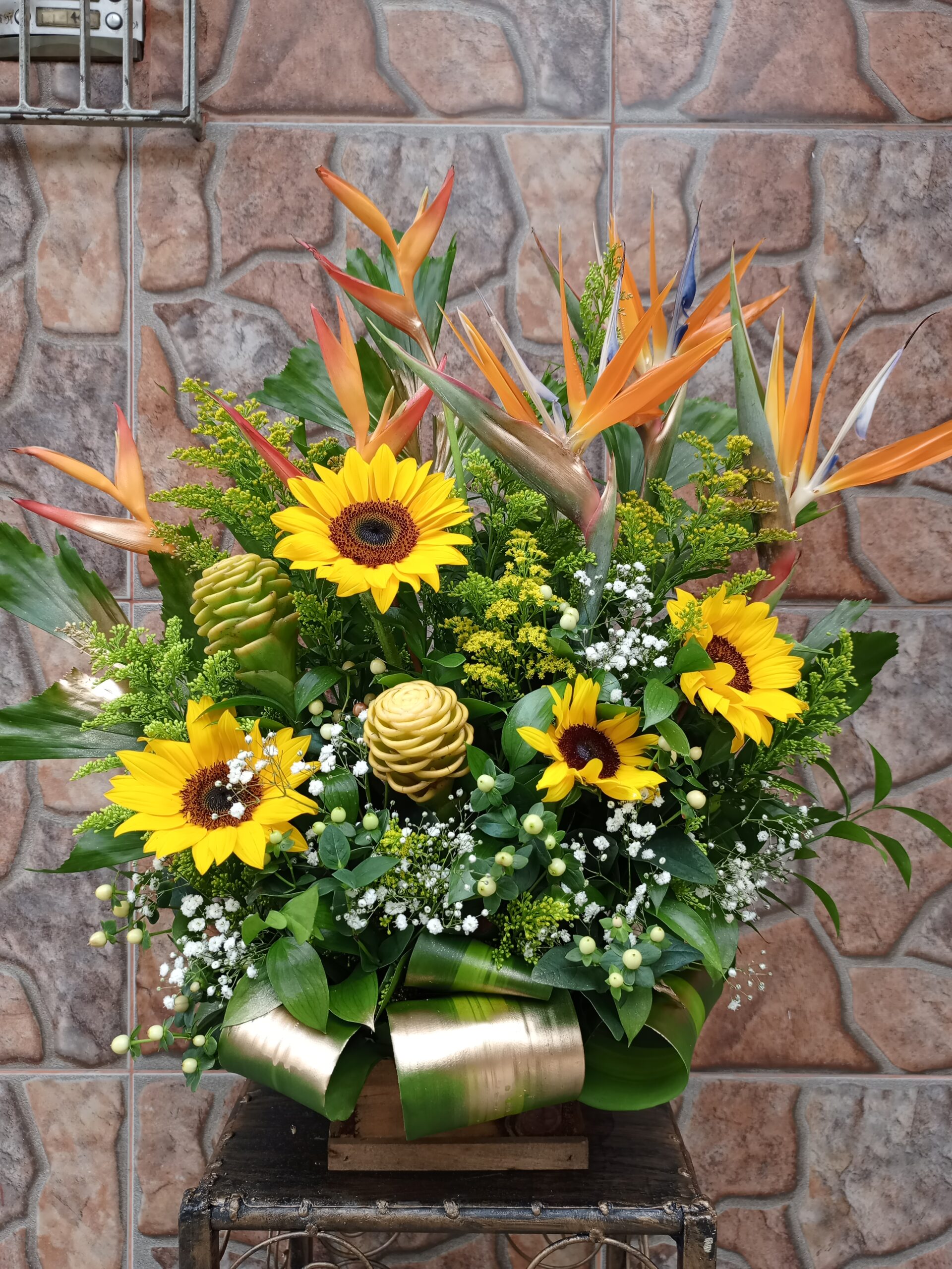 Ramo en base de madera con 4 girasoles, maracas, aves del paraíso, hoja de dracena, follaje solidago, hipérico, gipsofilia y tarjeta para mensaje.