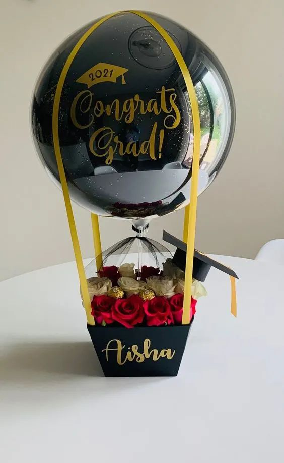 Arreglo floral forma globo con 12 rosas color opcional, chocolates ferrero x 3, decoración birrete y tarjeta para mensaje.
