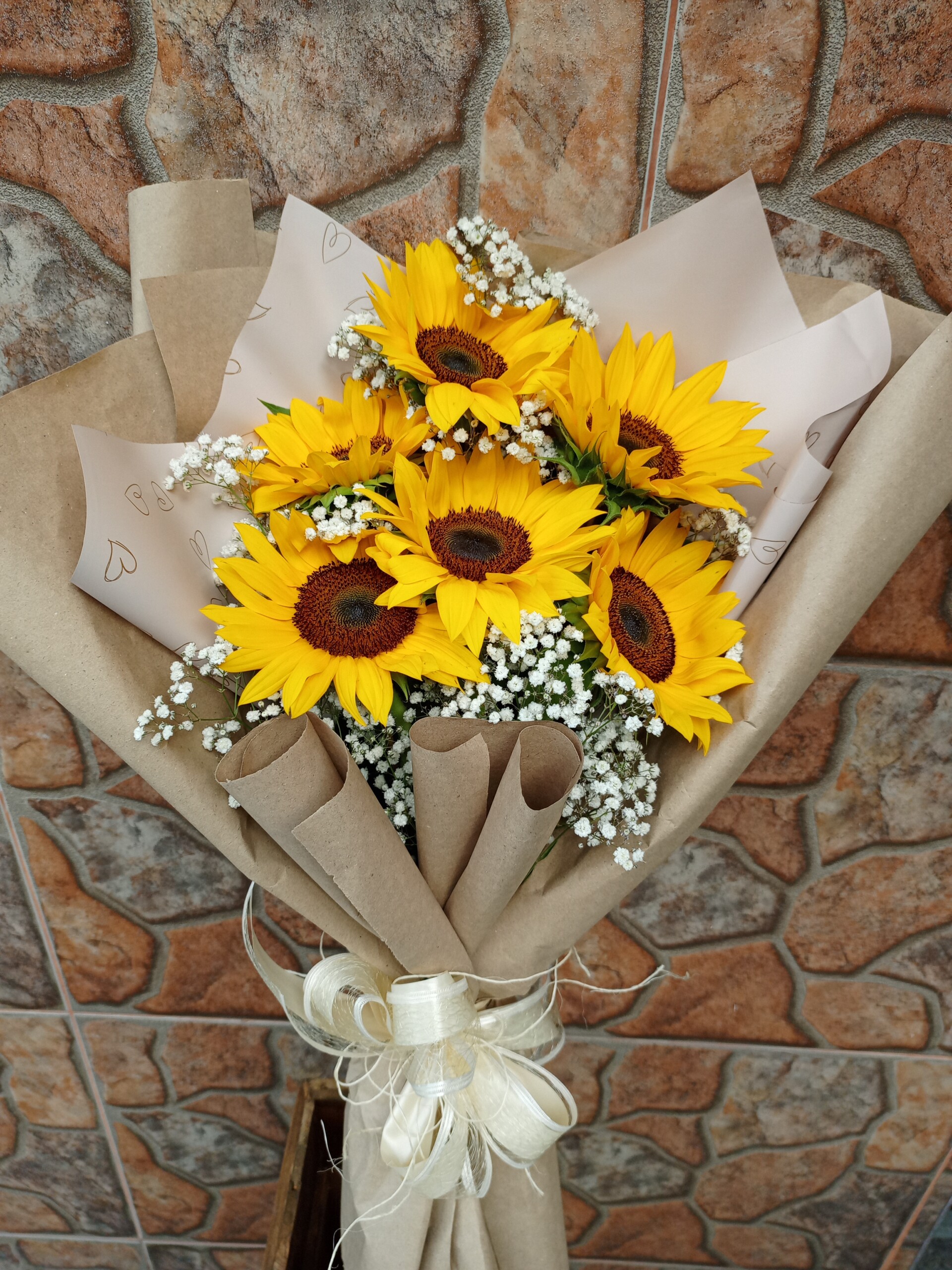 Bouquet con 6 girasoles, follaje gipsofilia, rusco, papel coreano, moño y tarjeta para mensaje.