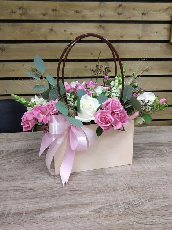 Cartera color beige, con arreglo floral, rosas, boca de dragón, follaje eucalipto, espiga, statis y tarjeta para mensaje.