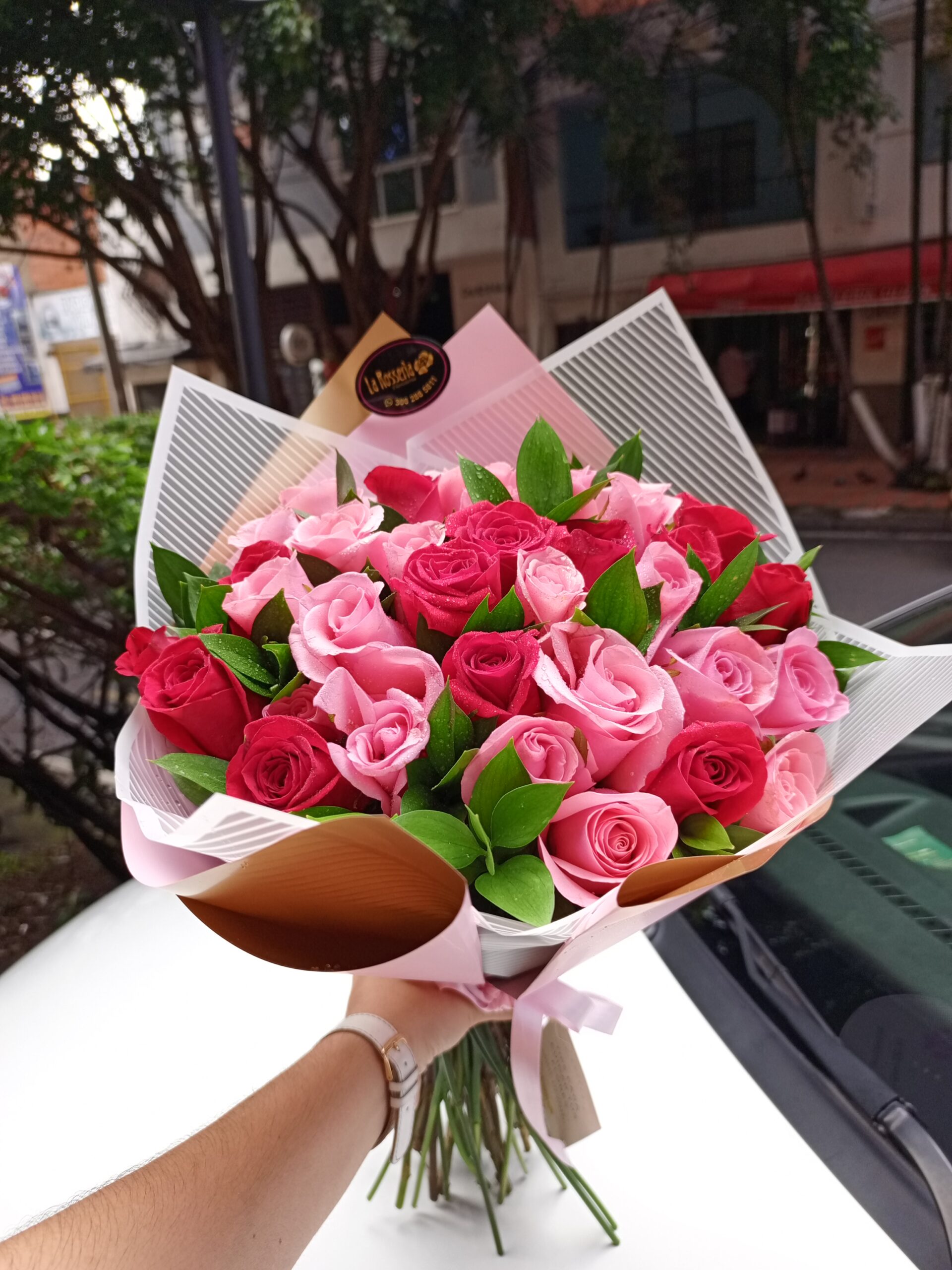 Bouquet con 35 rosas color de rosa opcional, follaje rusco, papel coreano, moño y tarjeta para mensaje.