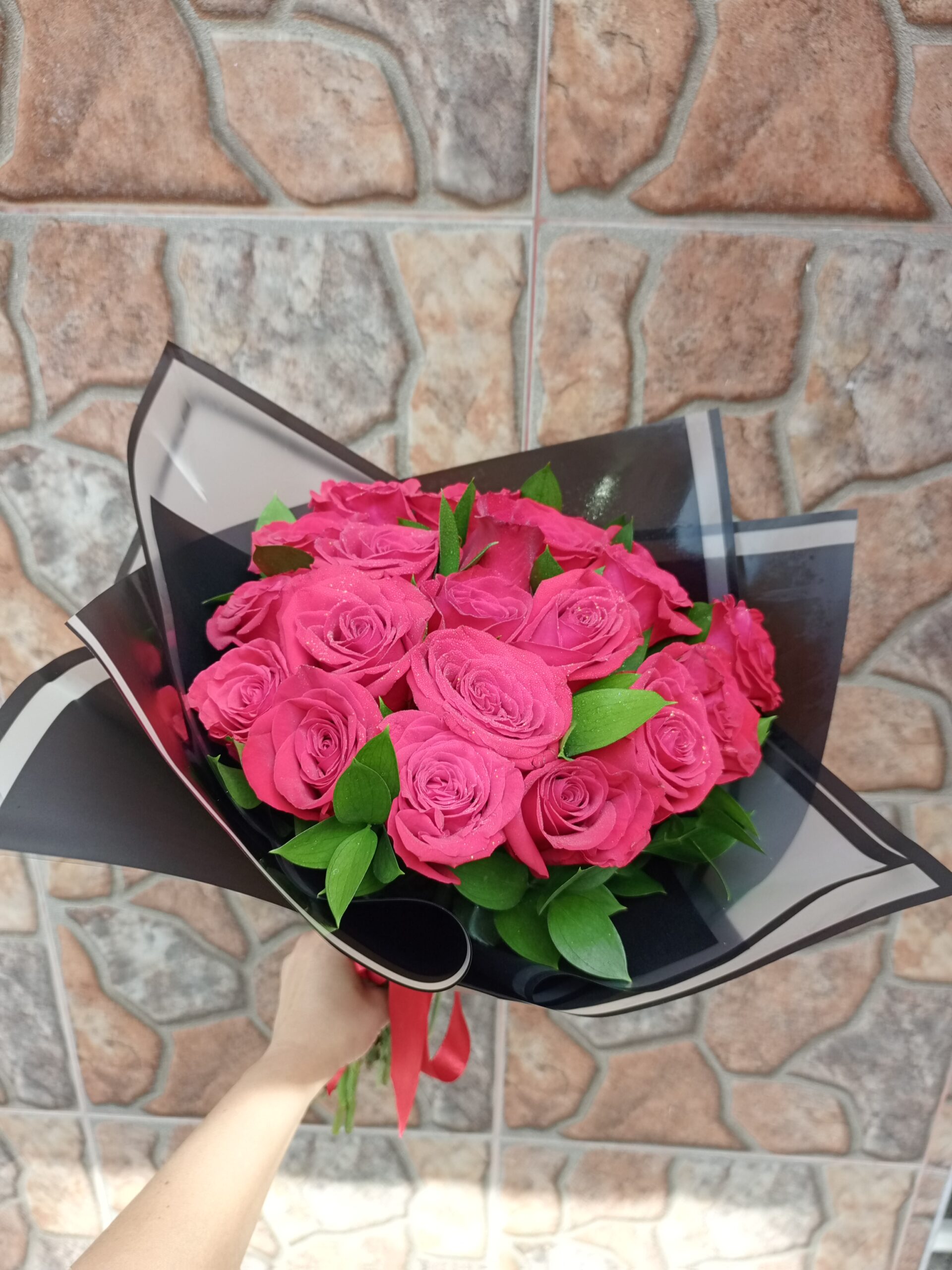 Bouquet con 20 rosas color opcional, follaje rusco, papel coreano, moño y tarjeta para mensaje.
