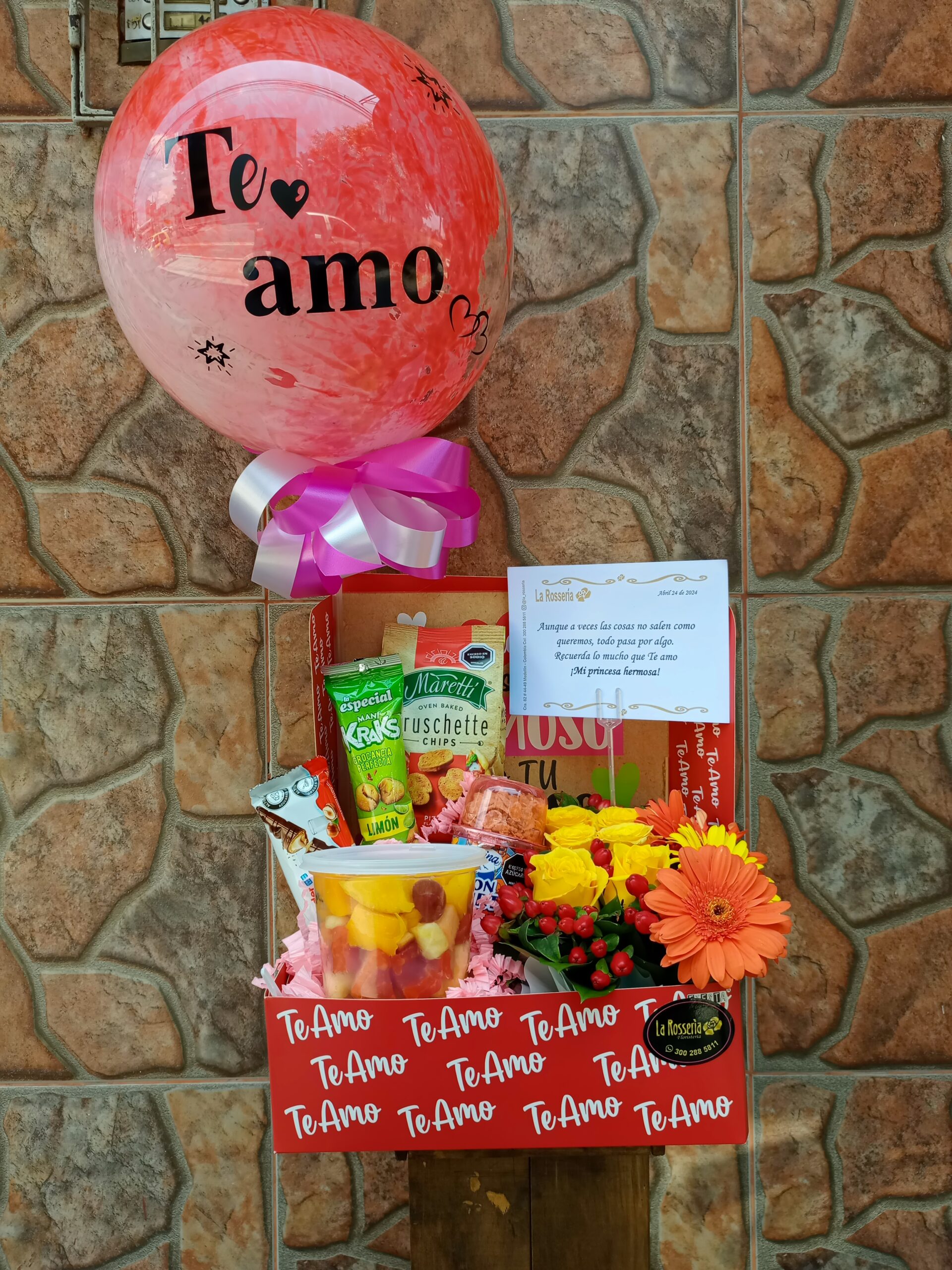 Caja con arreglo floral, gerberas, rosas, follaje hipérico y rusco, galletas gourmet, maní, yogurt con cereal. Chocolate Kínder bueno, ensalada de frutas, globo burbuja y tarjeta para mensaje.