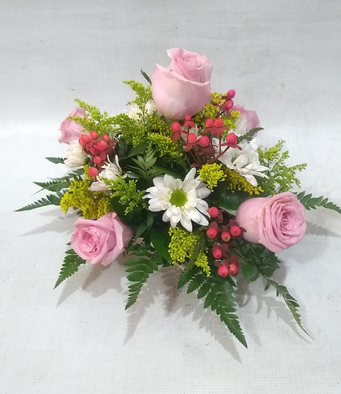 Centro de mesa con 6 rosas color opcional, margaritas, follaje solidago, helecho cuero, hipérico, rusco.