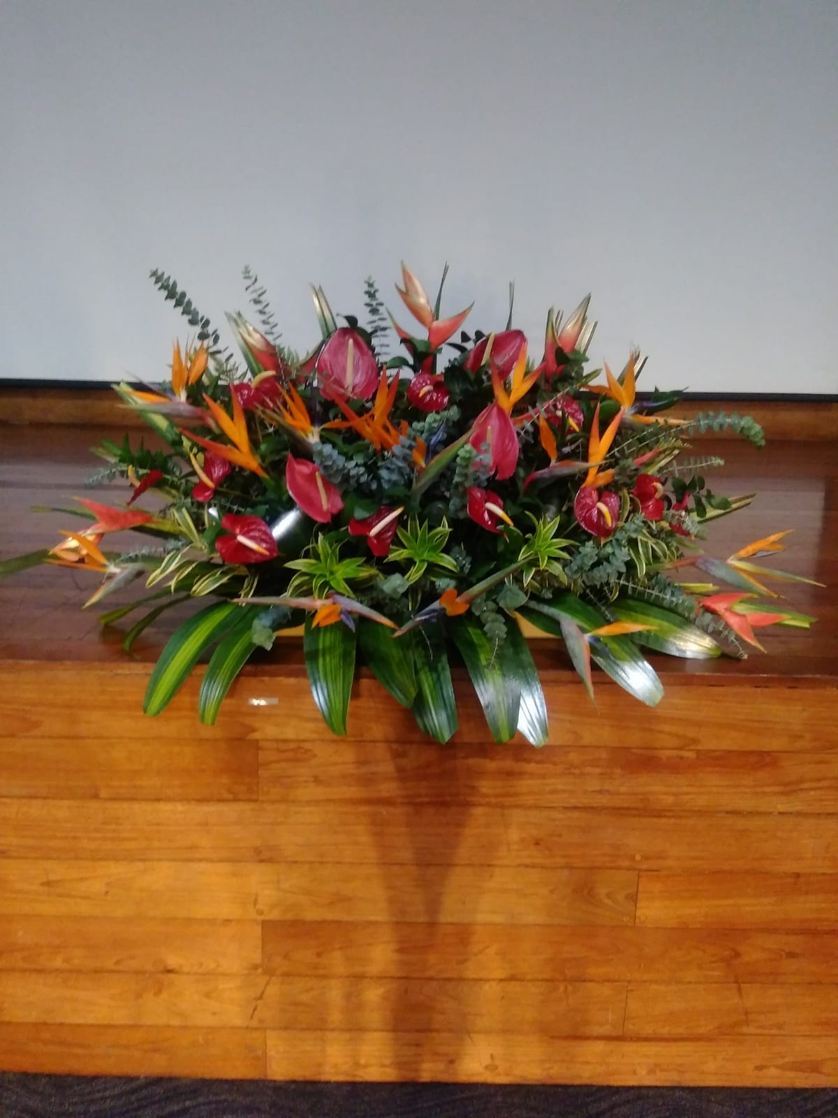 Jardinera con anturios, aves del paraíso, canción de la india, hojas de dracena y eucalipto.