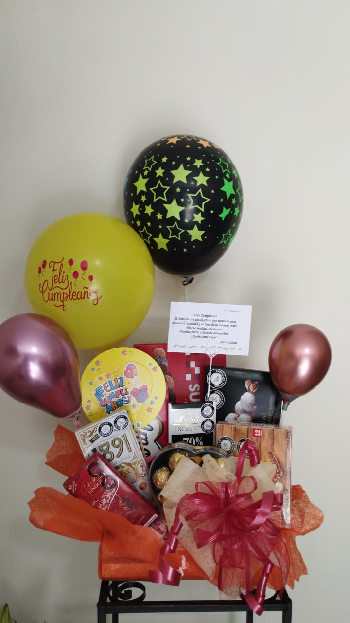 Ancheta decorada con globos, con 5 tipos de chocolates, paquete de galletas de almendra, paquete de galletas nutella, tarjeta para mensaje y moño.