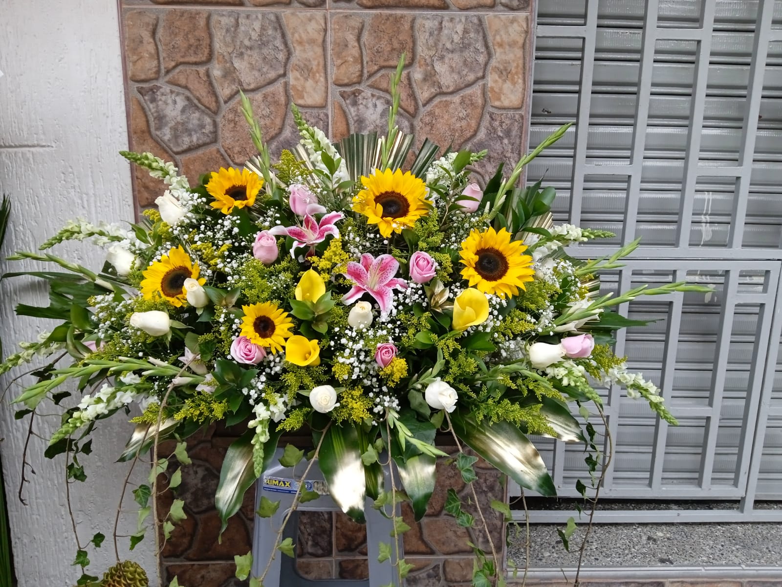 Jardinera con rosas color opcional, cartuchos, girasoles, lirios, boca dragón, follaje solidago, gipsofilia, rusco, hoja de dracena y hiedra.