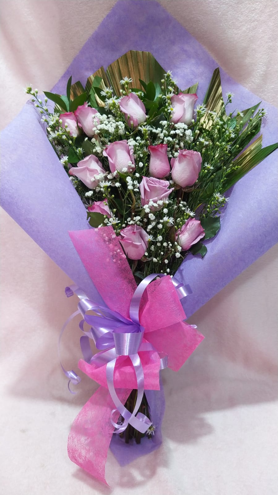 Ramillete con 12 rosas color opcional, follaje rusco, gipsofilia, aster blanco, tela micro fibra, moño y tarjeta para mensaje.