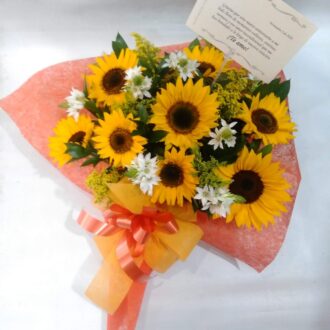 Ramillete con 5 rosas color opcional, claveles, 1 girasol, follaje eucalipto, gipsofilia, papel coreano, tull, moño y tarjeta para mensaje.