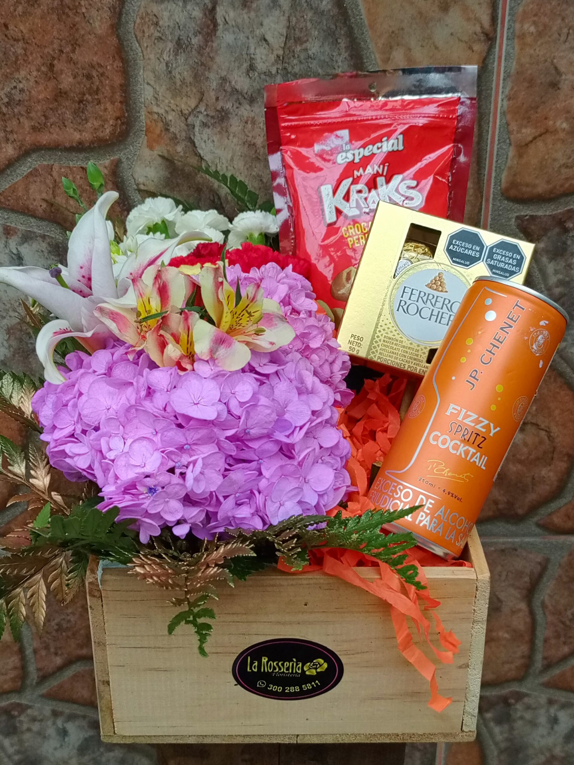 Base madera con arreglo floral, hortensia, astromelia, lirios y clavellinas, follaje helecho cuero, maní salado, caja de chocolates ferrero x 4, lata Jp chenet.