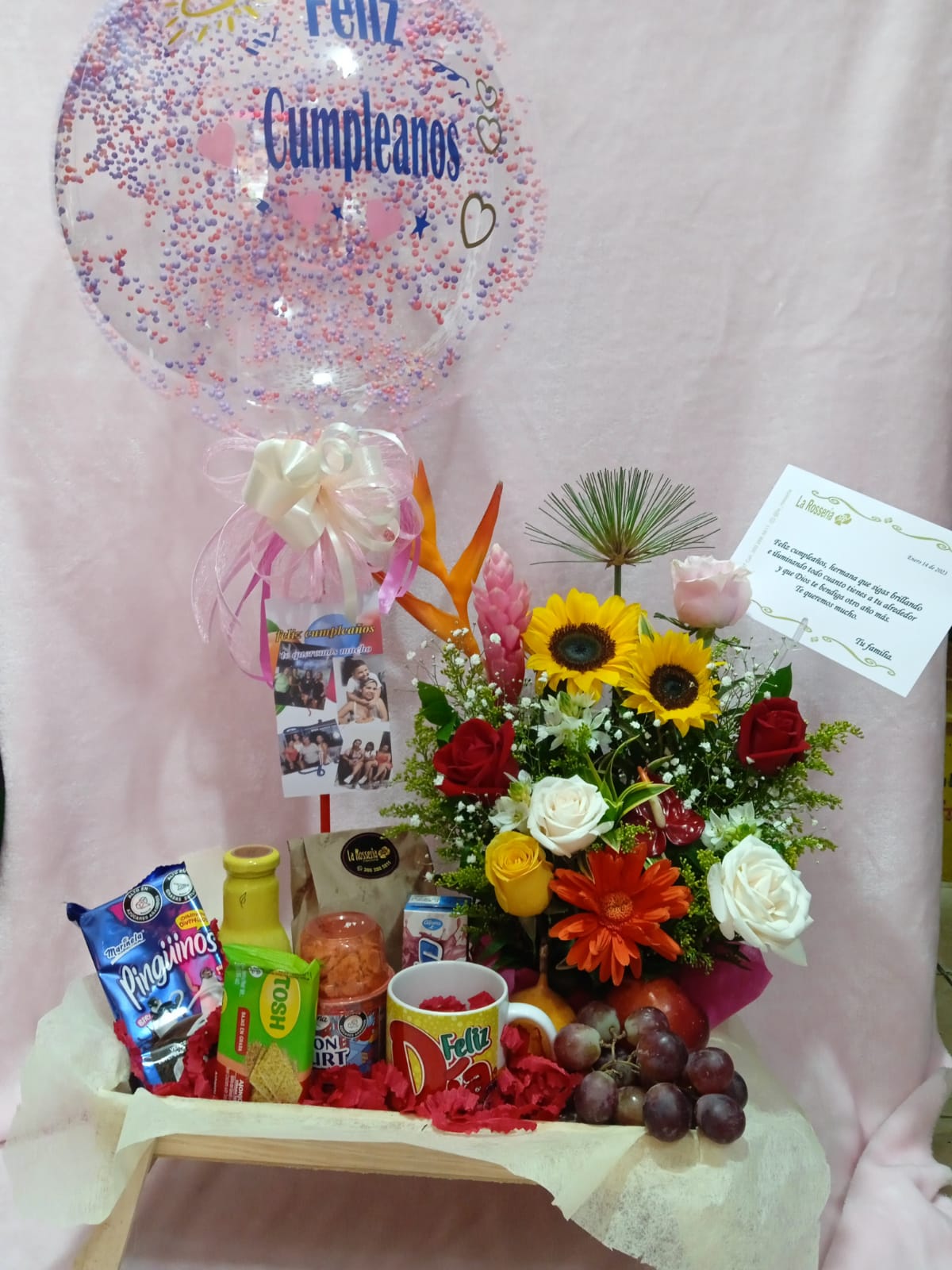 Mesa de desayuno con 4 frutas opcionales, ponqué pingüinos, bon yurt, té hatsu, alpin, galletas tosh, pastel horneado, mug, arreglo floral con 6 rosas color opcional, girasoles, gerbera, ginger, ave de paraíso, papiro, anturio, estrella de belén, follaje rusco, gipsofilia, solidago, canción de la india y tarjeta para mensaje.